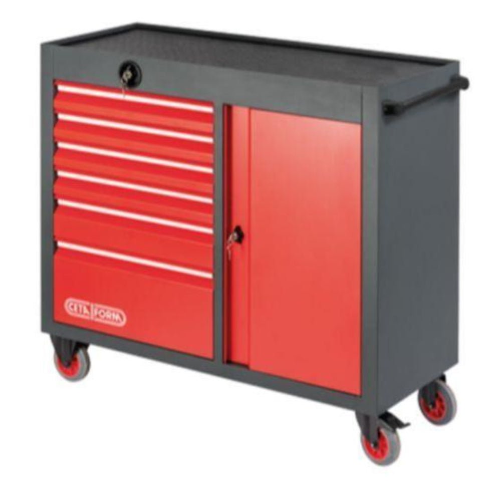 GT-PLUS XL Roller Cabinets (Empty) – 6 Drawers Ceta Form Tool Cabinets are very high quality, manufactured using heavy gauge steel and scratch-proof mat powder coating. GT-Plus XL Roller Cabinets are our premium range of tool cabinets with 6 drawers and a lockable cupboard. Features include an individual draw lock system to prevent unintential opening and a choice of 2 worktops. GT-Plus XL Roller Cabinets accommodate 3 foam system modules. SKU Number of draws Draw size HxWxD / mm Weight (kg) A01-06W 6 4x type1, H: 70 mm 1x type3, H: 110 mm 1x type5, H: 210 mm 997x1085x450 74 Product Description Body: • Torsion resistant profile construction from heavy gauge steel • Corrosion resistant and scratch-proof mat powder coated • Side section with two compartments • Lockable door for the side section • A01-06W: Recessed Workshop A01-06WW: Multiplex wood workshop (oil treated) Drawers: • Central locking with cylinder lock • Individual drawer lock system on each drawer to prevent unintentional opening • Low friction telescopic ball-bearing slides allowing 100% opening of drawers • Load capacity per drawer: 25 kg (50 kg for h 210 mm drawers) Wheel System: • Two fixed and 2 swiveling (one with brake) wheels, Ø125 mm • High quality TPU material resistant to chemicals Accessories: • Can be equipped with Ceta Form CFS Tool Modules • A01-W Series compatible with tool chest A06-08JX for capacity expansion • Compatible with A01-PL tool panelBody: • Torsion resistant profile construction from h