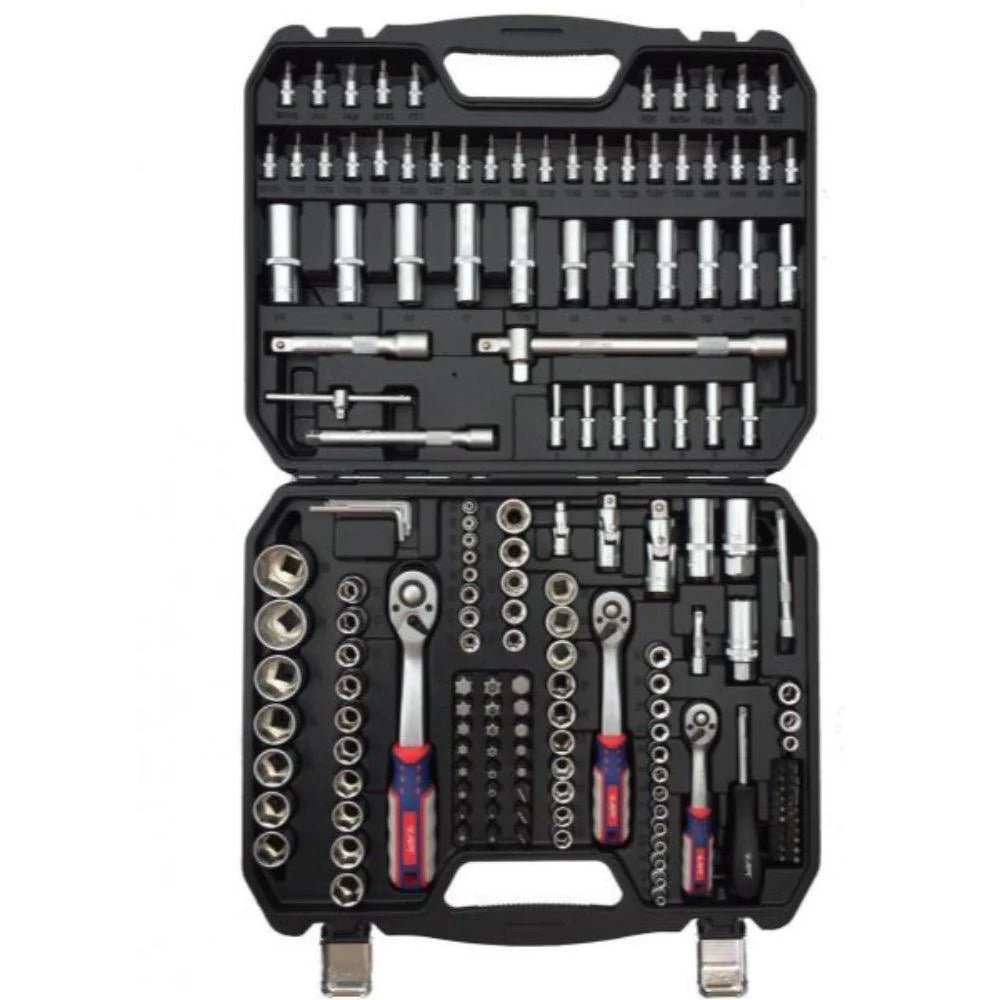 طقم عدة ميكانيكا 171 قطعة APT موديل 121171A طقم عدة ميكانيكا ولقم رباط 1/4 + 3/8 + 1/2 بوصة 171 قطعة ( لقم رباط مشرشرة + لقم آلن كي وتوركس ) شنطة بلاستيك APT موديل 121171A الموديل : 121171A الكود : 1215142172 عدد القطع : 171 قطعة ( 63 قطعة 1/2 بوصة + 27 قطعة 3/8 بوصة + 82 قطعة 1/4 بوصة ) العلامة التجارية : اي بي تي – APT بلد المنشأ : الصين