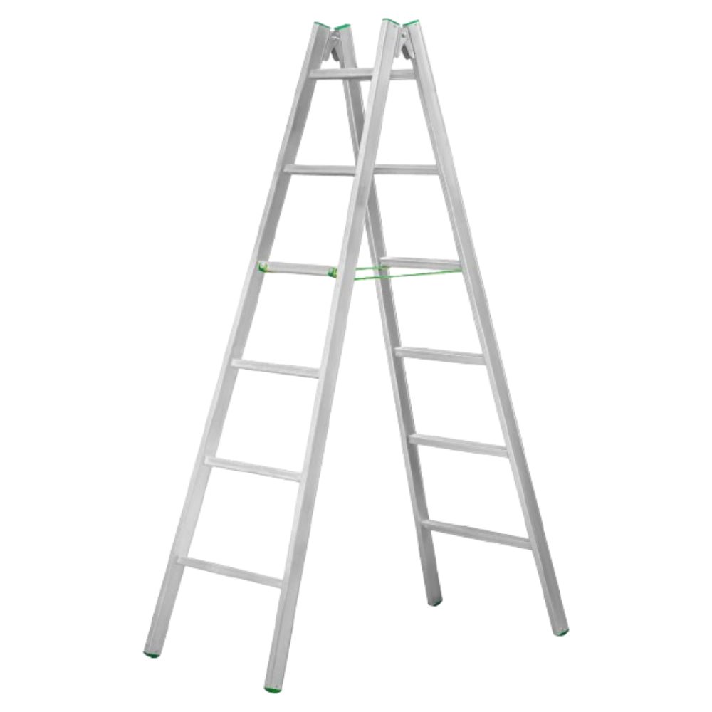سلم الومنيوم مزدوج طول 1.96 متر وبالعامل 3.06 متر وزن 9.00 كجم طراز 42.06 سلم الومنيوم مزدوج لاستخدام الصناعي الشاق درج السلم مانع للانزلاق مزود بكاوتش من الاسفل يساعد على انزان السلم يمكن الصعود من الجانبين مفصلات مجلفن مانع للصدأ