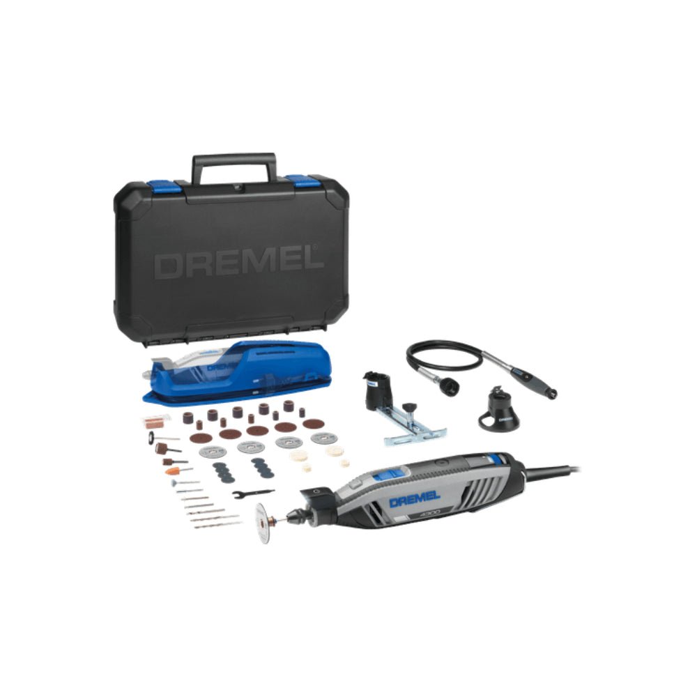 DREMEL® 4300 (4300-3/45EZ) أداة متعددة الاستخدامات – مضيئة. بلا حدود. أقصى طاقة. مثالي للعمل على أي مادة، ناعمة أو صلبة النحت والنقش والتوجيه والقطع والصنفرة والطحن والشحذ والتلميع والتنظيف. سلسلة مستمرة من المشاريع المختلفة التي يمكنك التعامل معها احصل على أفضل النتائج باستخدام مصباح LED الموجود في مقدمة الأداة. اعمل بأقصى قدر من الدقة، حتى في المناطق المظلمة قم ببساطة بتبديل الملحق وانتقل إلى الخطوة التالية من مشروعك DREMEL® 4300 (4300-3/45EZ) Multi-Tool – Luminous. Limitless. Max power. Ideal for working on any material, soft or hard Carving, engraving, routing, cutting, sanding, grinding, sharpening, polishing and cleaning. A constant stream of different projects you can tackle Get the best results with the LED light at the front of the tool. Work with the greatest precision, even in dark areas Simply swap the accessory and proceed to the next step of your project Endless possibilities – one tool. From sanding to grinding, and routing to cutting; this Multi-Tool produces power from job to job. Electronic feedback gives additional power when needed to maintain maximum performance when working with both soft and hard materials. You are always in perfect control of your projects. Even when working in awkward angles, tight spaces and dark areas. The 360° adjustable LED light at the front of the tool allows you to clearly see everything that you’re doing, so you can work with the greatest precision. Simply insert any accessory that fits your project and you’re ready to go With