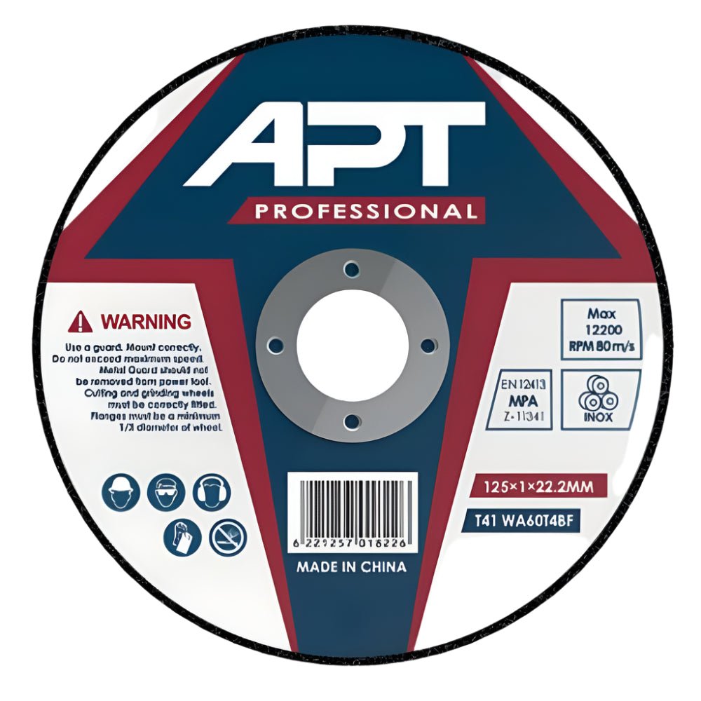 Cutting Disc Flat For Inox Cutting Disc Flat For Inox T41-115×1.0×22.2 Item Number Product Code Size Peripheral Speed (m/s) Max R.P.M Packet Qty Gw/Ctn Vol/Ctn Origin Type 9605401251024 APTP11251022 125 × 1.0 × 22.2 80 12200 400 13.80 0.011 CHN T41 حجارة قطعية حديد 125*1.0*22.2 مم موديل PRO اي بي تي APT حجر تقطيع حديد باقل قدر ممكن من الهدر عند عملية القطع بفضل سمك الحجر الضئيل مصنوع بجوده جيده بتصنيف PROFESSIONAL العلامة التجارية APT كود المنتج 9605401251024 قطر الحجر  D1 125 مم / 5 بوصة قطر الظرف D2 22.2 مم سمك الحجر T 1.0 مم عدد اللفات 12200 لفة ˉ¹ اقصى سرعة 80 الوزن – إبعاد المنتج – بلد المنشأ الصين