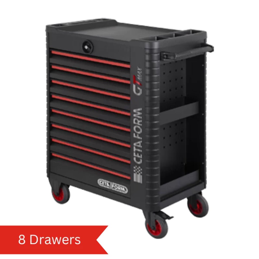 GT-MAX Roller Cabinets (Empty) Ceta Form Tool Cabinets are very high quality, manufactured using heavy gauge steel and scratch-proof mat powder coating. GT-Max Roller Cabinets are our deluxe range of tool cabinets featuring plastic protection on all corners and an anti-tilting system which allows only 1 drawer to be opened at any one time. GT-Max Roller Cabinets accommodate 3 foam system modules. A01M-08 8 7x type 1 H: 70 mm 1x type 2 H: 90 mm 1018x746x45 70 Designed by Ceta Form for the discerning professional, the GT-MAX Roller Cabinets stand as a pinnacle of durability and functionality. The torsion-resistant profile, made of sturdy heavy-gauge steel, ensures consistent stability. Its corrosion-resistant powder coating ensures both longevity and a highly scratch-resistant exterior. The integrated Euro-perforated side panel, designed for easily mounting our various optional accessories, offers seamless organisation. Reinforced corners provide impact protection while preserving the cabinet’s appealing exterior. The premium ABS worktop has compartments for storing small parts and special housings for screwdrivers. The central locking cylinder system provides seamless security, while individual drawer locks help prevent accidental openings. The anti-tilting mechanism protects users by preventing simultaneous access to multiple drawers. Full drawer extension is made possible by the low-friction telescopic ball-bearing slides, and each drawer boasts an impressive 25 kilogramme l
