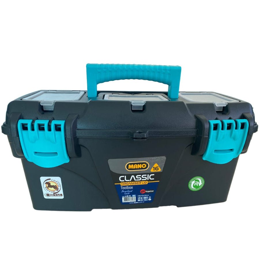 شنطة بلاستيك متعددة الاستخدامات سوداء بها في الداخل حافظه بلاستيك سوداء ومن الاعلى ثلاث حوافظ شفافه والشنطة مغلقه بقفل بلاستيك ، المقاس :- 410مم×209مم×195مم لون تركواز جديد