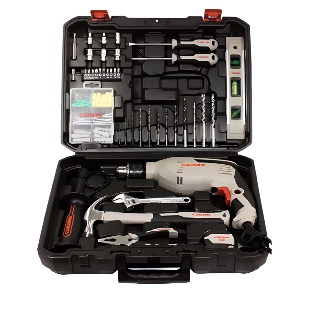 كراون CK10-XA98 طقم شنيور 13مم دقاق الكتروني ي/ش 600 وات 98 قطعة الطاقة المقدرة: 600 وات التيار عند الجهد: 220-230 فولت 2.8 أمبير سرعة عدم التحميل: 0-2800 دقيقة¹ معدل التأثير: 0-44800 دقيقة¹ نوع تشاك: تشاك حافة التروس نطاق شد الظرف: 1.5-13 ملم مخرجات الحفر في الخرسانة: 13 ملم مخرج الحفر في الفولاذ: 13 ملم مخرج الحفر في الخشب: 20 ملم الوزن: 1.7 كجم شنطة عدة كراون 98 قطعة مفتاح ظرف وشاكوش بخلاعة وزرادية ومتر قياس و مفتاح فرنساوى وميزان مياة توربيد ومفكات وبنط حدادى مقاسات مختلفة بنط خشابى مقاسات مختلفة بنط خرسانة مقاسات مختلفة وسنون مفك متنوعة ووصلة مغناطيسية طقم لقم 1/4بوصة Technical specifications Rated power 600 W Amperage at voltage 220-230 V 2.8 A No-load speed 0-2800 minˉ¹ Impact rate 0-44800 minˉ¹ Chuck type Keyless chuck Chuck tightening range 1,5-13 mm Drilling output in concrete 13 mm Drilling output in steel 13 mm Drilling output in wood 20 mm Weight 1,7 kg