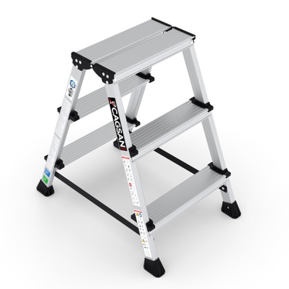 OLIMPOS – Double Sided Step Ladder It can be easily used in your home and office with its light and strong design made of aluminum. Steel rivets, which are used in wide steps, provide durability and long-lasting use. According to the user needs Olympos Stepladders are produced in different sizes from 2 steps up to 7 steps. (m.) (kg.) (W.xL.xH.xcm.) OL3 3 0,60 2,9 41,2×67,1×17,1 TECHNICAL INFORMATION – Height between steps: 21.6 cm. – The length of the steps: 80 mm. – Maximum load capacity 150 kg. Technical drawing : https://www.cagsanmerdiven.com/Uploads/Document/15bd75b6-9deb-4cbf-aa34-cc1d41ff0cdb.pdf Ladder User Manual – EN131 https://www.cagsanmerdiven.com/Uploads/Document/d6e18fed-db6c-4a2d-a137-3bc29563095c.pdf?v-638222543269505858 TÜV-SÜD EN131 Quality Certificate – Standing Ladders (BG-OL_HA) : https://www.cagsanmerdiven.com/Uploads/Document/9e02a677-c3e1-41f1-b384-629c07b3dc53.pdf?v-637979933173705968