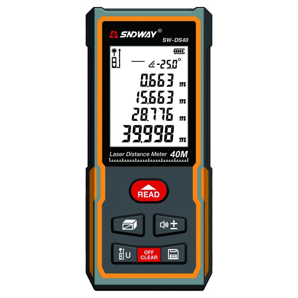 Meet the SNDWAY SW-DS Series Laser Rangefinder, featuring a large 2.0-inch LCD display and a host of powerful functions for precise measurements. With its high accuracy of 2.0mm and a broad measuring range (50M/70M/100M/120M), this rangefinder is designed for versatility. The device boasts a digital bubble level, angle measurement up to ±90 degrees, and functions for distance, area, volume, angle, Pythagorean calculations, and wall area measurement. Features Measurement Unit Options: Easily switch between meters, feet, and inches to accommodate your preferred unit of measurement. High Accuracy: Achieve exceptional precision with a remarkable accuracy of 2.0mm, ensuring detailed and reliable measurements. Wide Measuring Range: Choose from four measuring ranges (50M/70M/100M/120M) to cater to diverse project requirements. Front/Rear Benchmark: Set up front and rear benchmarks for customizable and flexible measurements. Digital Bubble Level: Ensure level measurements with the integrated digital bubble level, facilitating accurate angle measurements up to ±90 degrees. Versatile Measurement Functions: Perform distance, area, volume, angle, Pythagorean calculations, and wall area measurements effortlessly. Laser Type: Class II laser with a safe and efficient wavelength of 635nm and a power output of <1mW. Self-calibration Function: Maintain measurement accuracy over time with the self-calibration function, allowing adjustments from -9mm to +9mm. Data Store/Recall Function: Store an