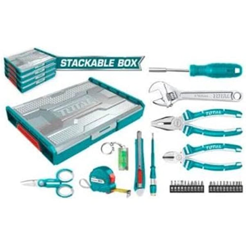 TOTAL Tools 29pcs THKTV02H291A Handbag Drawer Kit Brand totalset of hand tools with plastic bag 29 piecesmade in china 1 قطعة مفتاح فرنساوي قابل للتعديل 8 بوصة 1 قطعة متر قياس معدن 3 متر × 16 مم 1 قطعة حامل لقم مغناطيسي 100 مم 1 قطعة كماشة قطع قطري 6 بوصة 1 قطعة مشرط قابل للتعديل 20 قطعة لقم مفك براغي 1 قطعة كماشة 7 بوصة 1 قطعة مقص 5.5 بوصة 1 قارورة ميزان مياه 1 قطعة مفك تيست