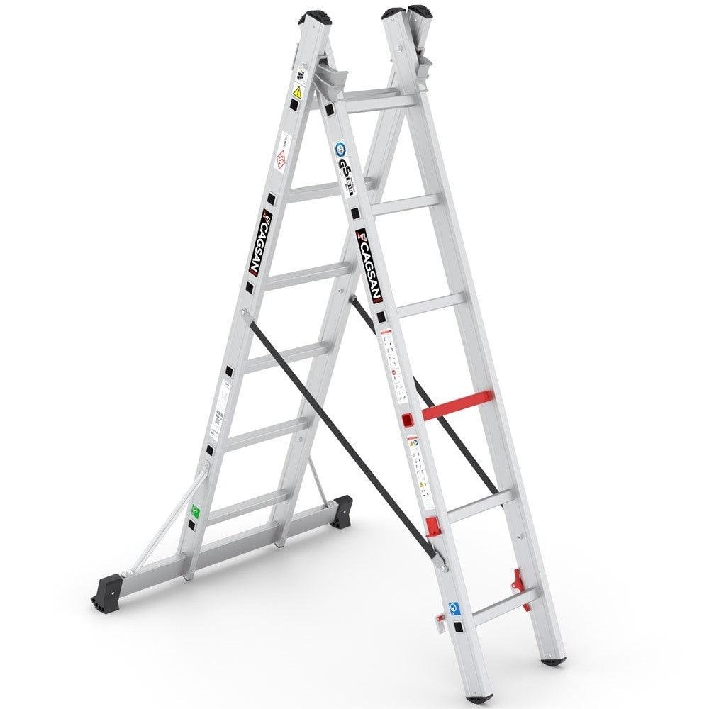 سلم المنيوم 2×6 درجة ارتفاع مفرد مقفول 1.88 متر ومجوز 1.77 متر واقصى ارتفاع مفرد 3.00 متر وزن 10.6 كجم كجسان صناعة تركي سلالم المنیوم قطعتین متعددة الاغراض 6 درجة خفیف, الامنیوم , مكین, سھل للاستعمال – سلم قابل للتمدید و سلم نوع في نفس الوقت الارتیغاع قابل تعدیل- درج مغلق بلمشبك – سلم الداخلي الامنیوم متروس- خطوة آمن لون الاحمر,لا انزلاق بواسطة الارجل الخاص تقیید الارتفاع- الارجل مساندة بالموازنات حزام الامن یمنع فتح السلم TSA4 – 6 Step Double Part Combination Ladders Flexibility, Portability and Safety! DUOCOMBI – Two-Piece Multipurpose Ladders are a flexible ladder solution that offers different usage options depending on your workspace. It facilitates your work and increases your work efficiency by providing the opportunity to use it both against the wall and as an A-type opening without resting anywhere. The lightweight structure of Çağsan DUOCOMBI ladders makes them easy to transport and provides mobility in work areas. It is also safe thanks to its durability and high carrying capacity. Made of high quality materials, DUOCOMBI ladders offer long-lasting use and are user-friendly with their ergonomic design. (m.) (m.) (m.)* (m.) (m.)* (kg.) (WxLxH/cm.) TSA4 2×6 1,88 1,77 3,0 3,00 3,8 10,6 41x188x16,8 * Average safe height when used on red step. TECHNICAL DETAILS – Beam Dimensions: 75×25 mm – Square Rung Profile: 30×30 mm – Maximum Load Capacity: 150 Kg. Flexibility and Multipurpose Use: DUOCOMBI ladders are a multi-purpose option that can be used both as a wall-mounted l